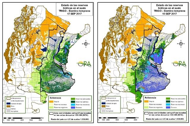 La situación hídrica al 17 (izquierda) y el 10 pasado (derecha)