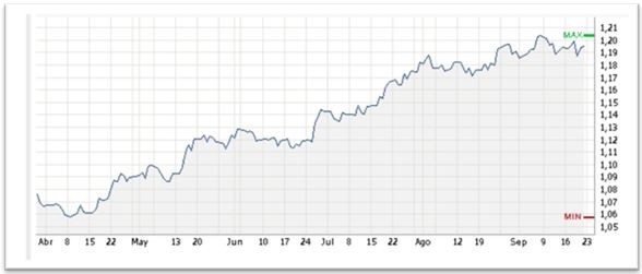 El gráfico (www.finanzas.com) muestra la evolución del euro desde abril de este año a la fecha.
