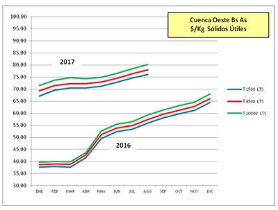 En Agosto, los precios de la leche en la Cuenca Oeste, mostraron sobre Julio una suba que merodeó 1,50%, en términos de “$/litro” y de 2,20%, expresado en “$/KSU” (kgs de sólidos útiles). En dólares, se ubicaron cerca de los u$s 0,32/litro, y los u$s 4,49/KSU ($17,40/u$s Márgenes Agrop. Ago 2017). Y la comparación interanual (a moneda corriente) muestra +33,8% en $/litro y +35,8% en $/KSU, respecto de Agosto 2016.