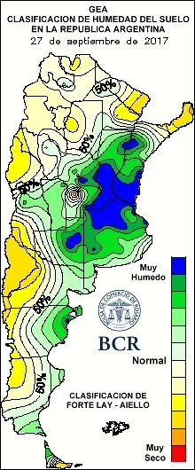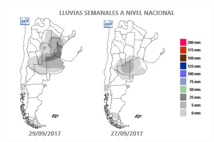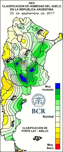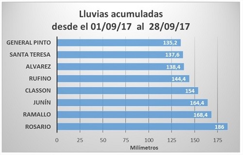 Indudablemente, el cambio climático sigue manifestándose en el corazón productivo de Argentina. Los 60 mm que marcan las medias estadísticas del mes, fueron ampliamente superados en este septiembre versión 2017. Hay zonas en la región núcleo en las que se duplicó y hasta se triplicó ese valor. Al 28 de setiembre, en Ramallo se llevan registrados 168 mm, 164 mm en Junín y 154 en Classon. En Rosario se alcanzaron los 185 mm. Para encontrar un registro que lo supere hay que buscar en el año 1972. En ese año, septiembre alcanzó los 236 mm.
