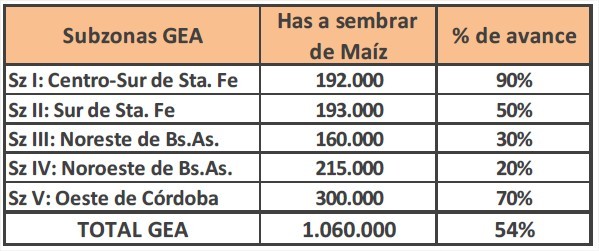 Casi 500.000 hectáreas de maíz aún faltan por implantarse en la región núcleo. Las lluvias no dan tregua, y seguir con las siembras maiceras así plantea serias incertidumbres en las áreas más afectadas. Hay lotes implantados que pueden haber quedado comprometidos por estas últimas lluvias. El avance se paralizó por las tormentas de esta semana y el progreso fue de tan solo 14 puntos, alcanzando el 53% de las 1,06 M de ha. El área más atrasada es el norte de Buenos Aires. Allí, solo se avanzó un 25%. El centro-sur de Santa Fe se destaca con un 90%.