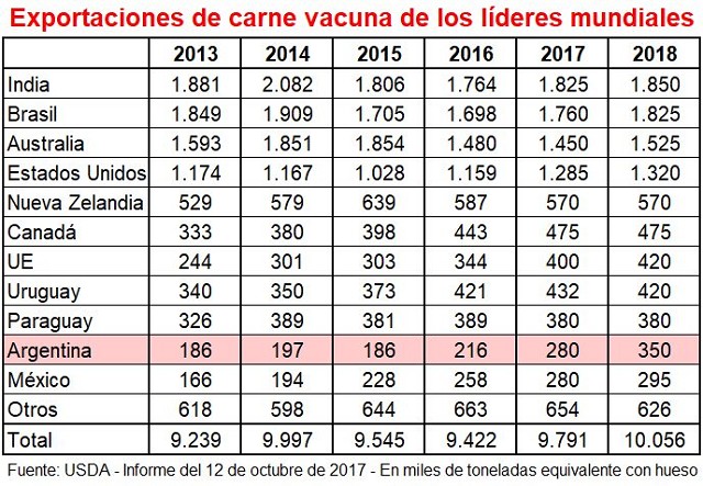 Ajustando los valores de ese informe al modo en que se convierte en la Argentina, o sea el volumen de la carne sin hueso a equivalente con hueso (acá usamos un factor de 1,5 mientras que en EE.UU. se usa 1,4) lo que el USDA está diciendo es que el país, que exportó 235 mil tec en 2016, terminará este año con 300 mil y para el próximo se esperan 375 mil.