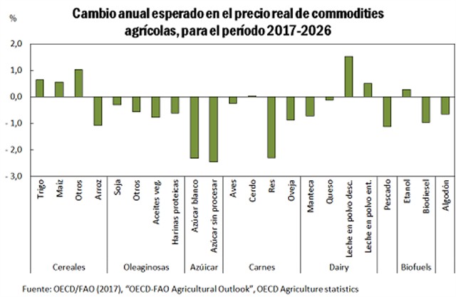 Según el reporte, para el trigo y el maíz se esperan aumentos de precios reales limitados de menos del 1% por año.
