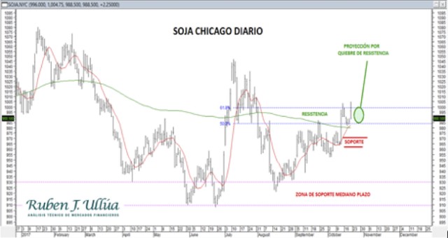 Si bien ha sido una semana de debilidad para el precio del commodity, donde el contrato con vencimiento noviembre/17 ha fallado en dar superación a la importante resistencia técnica que enfrenta la soja en torno a los 985-1000 centavos, dado que esta semana que pasó ha sido una semana de pase, donde muchos participantes salieron a cubrir posiciones del mes de noviembre para pasarse al mes de enero, por este motivo es que al tomar actualmente el valor de soja del contrato más negociado, que es enero/18, el precio no ha sufrido mayores variaciones y con ello las condiciones técnicas analíticas tampoco.