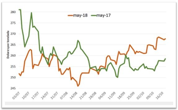 Con respecto a los precios de la oleaginosa, en el mercado local -ahora que acaba de comenzar la siembra- hay que destacar que, con relación al año pasado, el último trimestre muestra precios superiores.