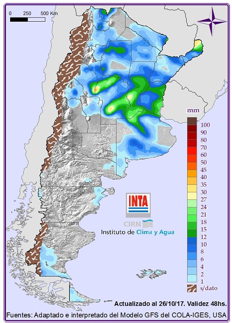 Según informó el INTA, para mañana 27 de octubre se espera un ingreso de aire frío que se desplazaría sobre el centro del país. El cual podría provocar lluvias y tormentas de varianda intensidad sobre el este y norte de la región Pampeana y Cuyo. El frente frio se extender hacia el norte. Además están pronosticados vientos que rotaran al sector sur con leve descenso de las temperaturas.