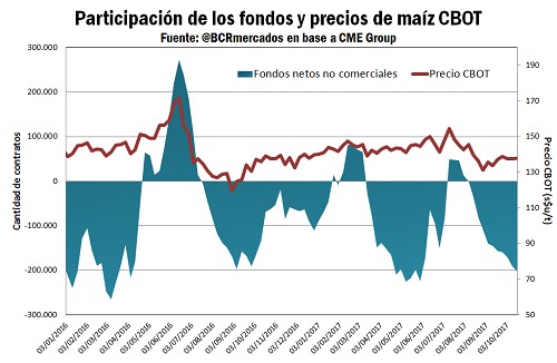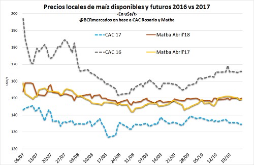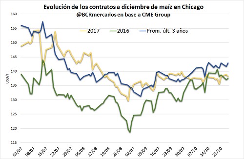 Desde mediados de septiembre, el contrato de maíz a diciembre en el mercado de Chicago fluctúa en torno a u$s 138 /t, por lo que este precio permanece por debajo del promedio de los últimos 3 años desde el inicio de octubre.