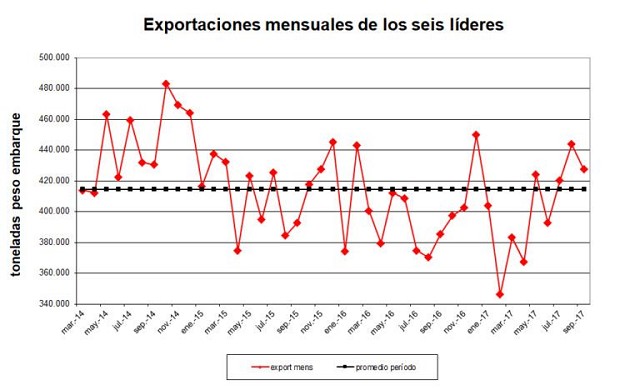En julio, agosto y septiembre de 2107, los volúmenes embarcados crecieron el 10-20% interanual, tras un par de años con mayoría de registros mensuales negativos. De esta manera, lo sucedido en estos tres meses ha posibilitado compensar las caídas previas. En septiembre, las exportaciones de 12 meses acumulados resultaron sólo 2% menores a las del año anterior.