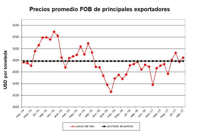 En esa línea, en los últimos ocho meses, los precios medios registraron un aumento interanual consecutivo de hasta el 5%. Así, el precio promedio FOB ponderado de estos exportadores resultó en este último trimestre 1% mayor interanual, por primera vez tras más de dos años de reducciones consecutivas.