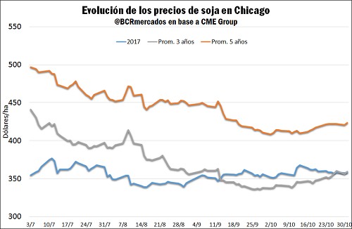 Mientras la cosecha de soja en los lotes estadounidenses ingresa en la recta final con un progreso del 83% (levemente por detrás del promedio de las últimas 5 campañas), el comportamiento de los contratos en Chicago no presentan una caída estacional tan marcada como sí sucedió en años anteriores gracias a la avidez de la demanda China que dio sostén a los precios en el mercado de Chicago durante la cosecha. Hoy, los valores negociados para el contrato más cercano se encuentran en línea con el promedio de los últimos tres años.