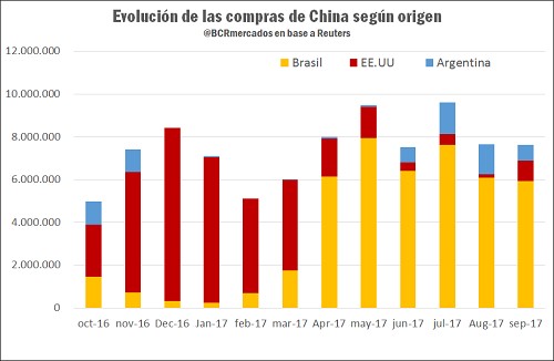 En el mes de septiembre las exportaciones de soja estadounidense acumularon 937 mil toneladas, marcando un retroceso del 31% sobre el mismo mes de 2016. El papel principal como proveedor lo tomó Brasil que exportó 5,9 Mt; es decir, un 60% más que septiembre 2016 representando el 73% de las compras totales de septiembre (8,1 Mt).