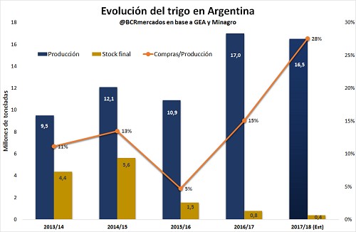 En tanto, en Argentina, las cosechadoras arrancaron desde el norte arrojando productividades por encima de lo esperado. Sin embargo, algunos eventos climáticos (inundaciones, altas temperaturas y granizo), sumado a otros factores bióticos (fuerte presión de manchas y roya y algo de fusarium y pulgones) recortaron la producción nacional. Según GEA - Guía Estratégica para el Agro, la producción se ubicaría en 16,3 - 16,5 Mt frente al record de 17 Mt de la campaña pasada.