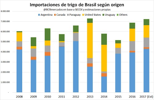 Como se puede apreciar en el gráfico respectivo, en los últimos años Argentina fue recuperando su papel protagónico como exportador a Brasil. Ante su menor producción de trigo, se intuye que las compras brasileñas serán más activas para satisfacer ese déficit de mercadería, traccionando así a los precios locales