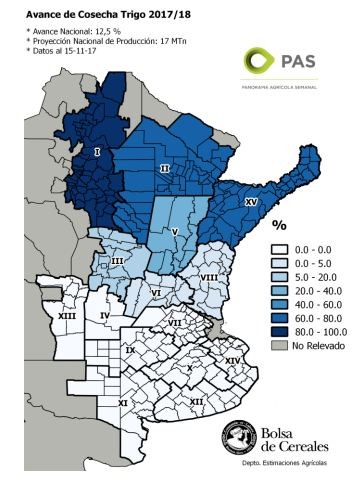 En el Centro-Norte de Córdoba la cosecha del cereal transita sus primeros pasos, mientras que en el sur de la provincia los lotes se encuentran en madurez fisiológica y serían recolectados en el transcurso de las próximas semanas. Los rendimientos esperados en los núcleos trigueros del sur cordobés superarían al promedio de las ultimas 5 campañas, pero se ubicarían por debajo de los acumulados durante el ciclo 2016/17.