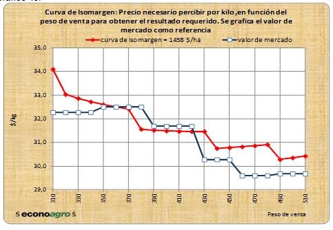 Para poder dar una respuesta a dicha pregunta se deben parametrizar los resultados del modelo en cuestión, a distintos pesos de faena, por supuesto siempre respetando la misma oferta energética. Si se quisiera elevar el peso de faena, con la misma oferta energética deberá bajarse la carga, buscando que la demanda energética nunca supere la oferta. Se construye luego una curva de iso margen, modelizando las distintas situaciones, de manera de averiguar a qué precio debería vender un animal a un peso de faena diferente para obtener el mismo margen.