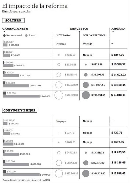 Para los casados con dos hijos, en el caso de una ganancia neta mensual de $ 20.000 se aplica hasta hoy una tasa efectiva de 1% ($ 2687 al año). Con la reforma se deja de pagar (la tasa pasa a ser 0%). Para un ingreso mensual de $ 30.000, la tasa es hoy de 7% ($ 24.713 al año) y pasaría a ser de 4% tras la reforma. Se ahorraría $ 11.423 anuales. Para los ingresos de entre $ 50.000 y $ 70.000 ya mencionados, el ahorro es de $ 18.188 al año (la tasa efectiva pasa de 16% a 13% y de 22% a 20%).