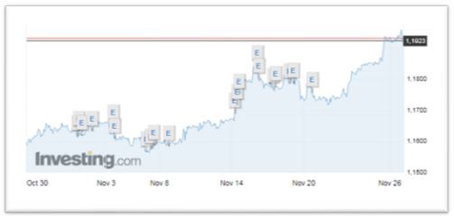 El gráfico que sigue muestra cómo a lo largo de noviembre se va necesitando cada vez más unidades de dólares para adquirir unidades de euro.