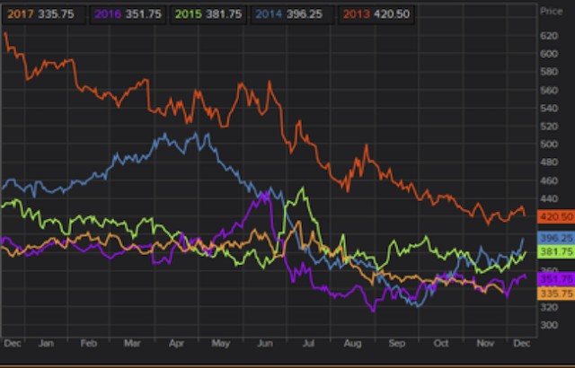 Mientras tanto, el maíz establece un nuevo piso (ver grafico) en el contrato de diciembre (Linea naranja) queriendo conicidir con el estacional del año pasado (Linea violeta) a finales de noviembre. El spread de CZ-CH que se había achicado semanas atrás, se volvió agradar a los niveles máximos y siendo primer día de notificación de las posiciones de diciembre este jueves, el que esta comprado “Largo” entrará en el delivery o tendrá que pagar el spread contra el marzo, lastimosamente. La otra cuestión interesante de observar es el pequeño rebote que los futuros de maíz presentan llegando a fin de año, y esto ha sucedido en los últimos 3 años. Nada nos indica que esto si o si debiera marcar una tendencia, pero nuevamente, con fondos que continúan cortos (a pesar de la compra de 20 mil lotes esta semana), y un pronóstico incierto de lluvias en plena etapa de desarrollo de cultivos en Sudamérica.