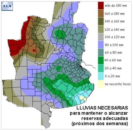 Los eventos pluviales se han presentado quizá con la frecuencia habitual, sin embargo su modestos aportes no han podido sostener las reservas y por lo tanto recuperar un buen nivel de agua en el perfil, ya comienza a tornarse menos probable. En el mapa que mostramos a continuación, se estima el nivel de lluvias necesarias en los próximos quince días para recuperar la humedad del perfil, al fin de alcanzar un nivel adecuado.