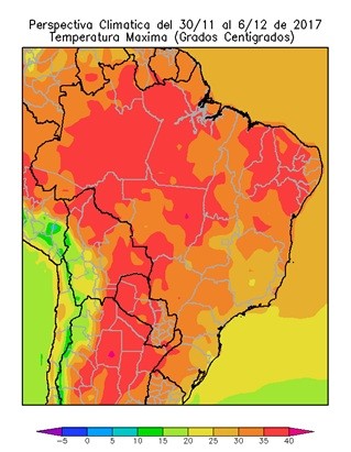 La perspectiva comenzará con vientos del trópico, que causarán un marcado incremento de la temperatura en la mayor parte del área agrícola del Brasil, salvo en el litoral atlántico, que recibirá vientos marinos que moderarán los registros.