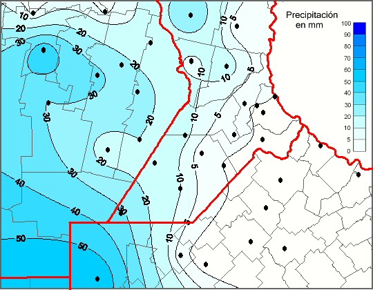 Las lluvias comenzaron ayer (29/11). Estuvieron localizadas en el centro oeste del país, en la esquina que cruza las cuatro provincias: Santa Fe, Buenos Aires, Córdoba y La Pampa. Se trata de un área modesta. El sur de Córdoba fue la que recibió el mayor impacto y las lluvias más importantes, con registros de hasta 50 mm. Hoy, ya se llevan registrado lluvias de 30 a 45 mm en La Pampa.