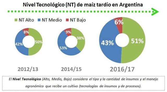 De ese estudio se destaca el aumento del nivel tecnológico del maíz tardío durante. Al comparar la campaña 2014/15 y luego la 2016/17, tras la eliminación de las retenciones al cereal y de las trabas para exportar, hubo una mejora en la tecnología aplicada por el productor.