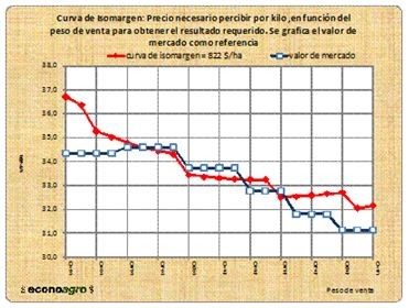La mayor distancia positiva entre las dos curvas se da justo antes de los 350 kilos (el precio cae 50 centavos), motivo por el cual desde el punto de vista económico, ese será el peso de venta más apropiado para el modelo analizado. Pero es a partir de los 390 kilos (la cotización vuelve a caer otros 50 ctvs), en donde el precio de venta del mercado es inferior al que se precisa para igualar el resultado del isomargen. Las caídas en las cotizaciones que se dan por encima de los 420 kilos hacen que el precio necesario para el isomargen se aleje considerablemente, y es mucho peor a partir de los 460 kilos, donde además el precio de isomargen aumenta, con lo cual la distancia entre las 2 curvas se hace mucho mayor