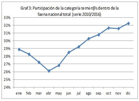b) Menor participación de la categoría terner@s en el total de animales faenados durante abril mayo (grafico 3, datos IPCVA), y aumento de la misma durante la primavera.