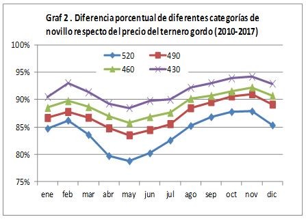 Las categorías de mayor peso vivo tienen un precio por kilo menor, a las más livianas. El grafico 2 representa el comportamiento mensual promedio de cuatro categorías diferentes respecto del precio del ternero gordo. Todos los valores corresponden a los promedios mensuales del mercado de Liniers.