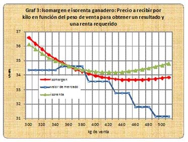 El punto en que se cruzan las tres curvas representa al modelo tenido en cuenta en la tabla 2, o sea los 360 kilos de peso de salida. En ese punto intersecta al precio de venta del mercado (34,61 $/kg) para un margen por cabeza de 370,7 y una renta mensual de 0,72%. Para otros kilajes de venta los precios deberán variar para obtener igual margen (curva roja) o igual renta (curva verde)