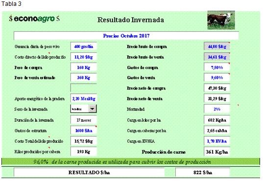 • El precio neto de compra, sumado los gastos de comercialización, es de 47,3 $/kg y el neto de venta 31,29 $/kg, la producción por animal invernado es de 193 Kg en un lapso de 17 meses. El resultado anualizado y expresado por unidad de área sea de $/ha 822.