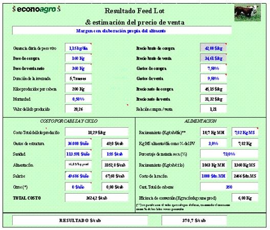 Es posible estimar, cuál será el peso de salida más conveniente desde el punto de vista económico. A diferencia del engorde a campo con o sin suplementación, aquí adquiere un aspecto relevante el costo del kilo producido. Está dependencia se explica por la alta incidencia que tiene el costo del alimento en la producción de carne y por la caída de la eficiencia de conversión a medida que aumenta el peso vivo del animal.