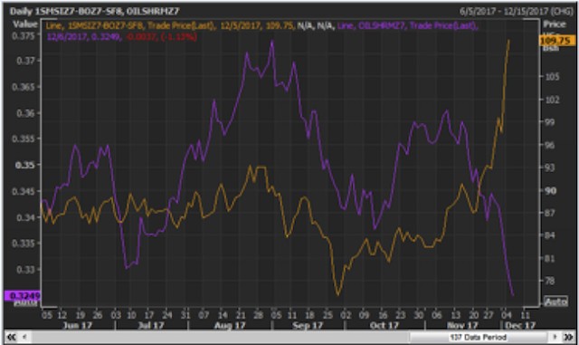 La harina, en realidad es la gran responsable de esta fenomenal actuación, y sin saber porque, muchos aluden a que Argentina - siendo el principal exportador de harina de soja del mundo- podría poner en riesgo ese rol. Sabemos que aún esto no es real, pero el mercado aprovechó esta excusa y los márgenes de molienda son muy buenos en la pantalla de Chicago (línea naranja), incluso mejores que el año pasado. Y mientras la harina hace lo suyo, el aceite se derrite y su relación conjunta (oilshare) (línea violeta) se encuentra se encuentra en los mínimos de los últimos meses. Es curioso como el aceite, que es el único producto que tiene una historia menos bajista fundamental o más ajustada, es el que menos participa de este rally, si lo podemos llamar así.