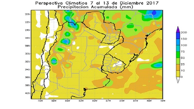 La perspectiva comenzará con el paso de un frente de tormenta, que producirá precipitaciones moderadas a muy abundantes, con focos de tormentas severas, sobre el extremo noroeste del área agrícola, mientras que la mayor parte del resto de su extensión recibirá valores moderados a escasos. Detrás del frente, arribará una masa de aire frío, que provocará un descenso térmico por debajo del promedio estacional. El proceso terminará con vientos del norte, que provocarán una ola de calor en la mayor parte del área agrícola, mientras que sólo las zonas cercanas al litoral atlántico recibirán vientos marinos que moderarán los registros.