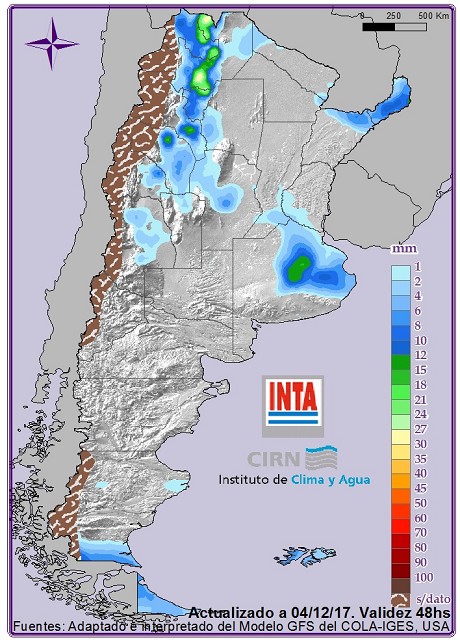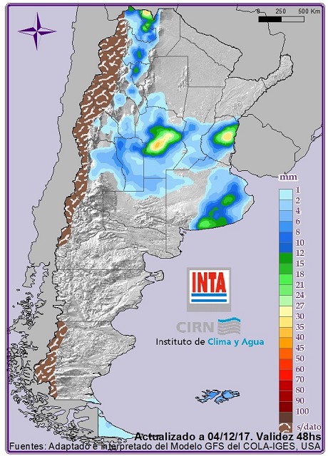 En la porción centro se prevé que un frente frío afecte con lluvias y tormentas de variada intensidad las provincias de Córdoba, sur de Santa Fe, Entre Ríos y este de Bs. As.