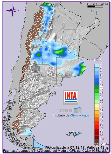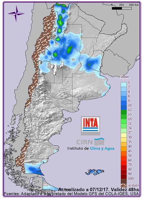 En la región Patagónica se mantendrían las condiciones del tiempo bueno sobre el centro y norte de la región, pero con algunas lluvias y cielo nuboso sobre el extremo sur.