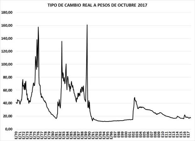 Como puede verse en el gráfico 2, el tipo el tipo de cambio actual está casi en el mismo nivel de la convertibilidad o al final de la tablita cambiaria de Martínez de Hoz en enero de 1981.