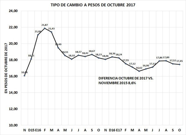 Por otro lado, el uso de la tasa de interés genera un arbitraje tasa versus dólar que retrasa artificialmente el tipo de cambio real. Si tomamos el tipo de cambio de noviembre 2015 (último mes k) contra octubre de este año, a pesos constantes tenemos que el tipo de cambio estuvo solo un 8,6% por encima del tipo de cambio de noviembre 2015
