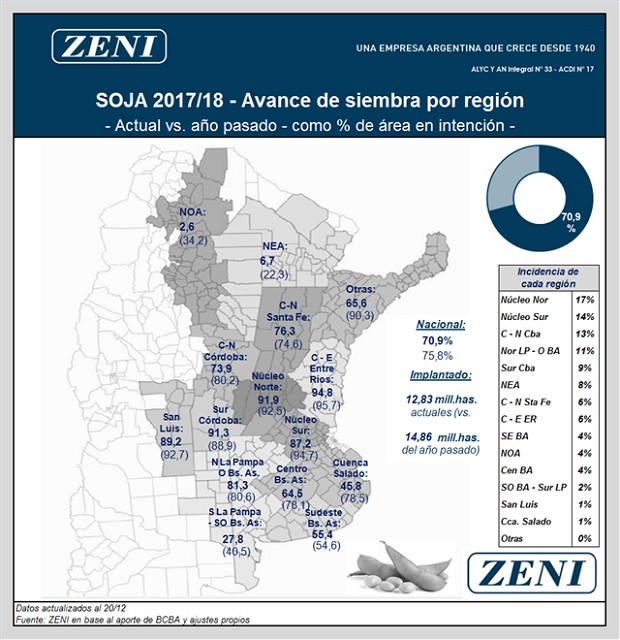 En un mapa, Zeni detalló los avances regionales de siembra de soja. Entre