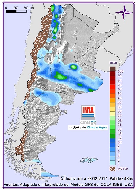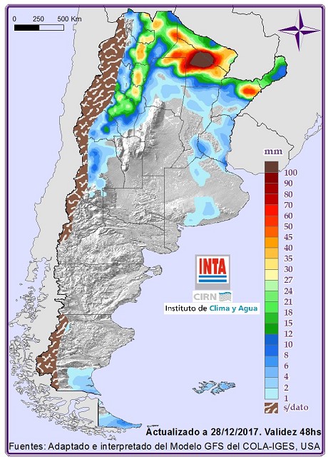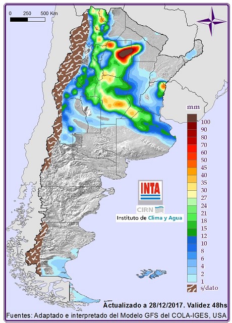 El desplazamiento del sistema frontal hacia el norte del país, provocará lluvias sobre el centro y noroeste argentino. Los mayores acumulados diarios se esperan sobre las provincias de Córdoba, sur de Santa Fe, Santiago del Estero y norte de Entre Ríos, con tormentas de variada intensidad algunas locamente intensas. Se prevé descenso de las temperaturas sobre el centro del país, continuando el ambiente más cálido sobre el norte argentino. Sobre la Patagonia se esperan buenas condiciones del tiempo con cielo parcial a algo nublado, inestable sobre el sur de la región.