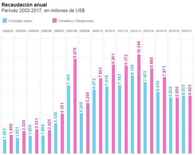 Los derechos de exportación al trigo, el maíz y el girasol, entre otros productos, se eliminaron en diciembre de 2015 cuando asumió el presidente Mauricio Macri. En soja, se redujeron del 35 al 30%. Este mes, en soja comenzó una rebaja mensual del 0,5% hasta diciembre de 2019.
