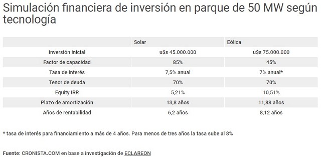 En la simulación para los dos parques de 50 MW, la cantidad de tiempo necesaria para amortizar la inversión inicial es menor en el proyecto eólico que en el solar fotovoltaico. Mientras que en el primer caso se necesitan casi 12 años, en el segundo lleva casi 14.