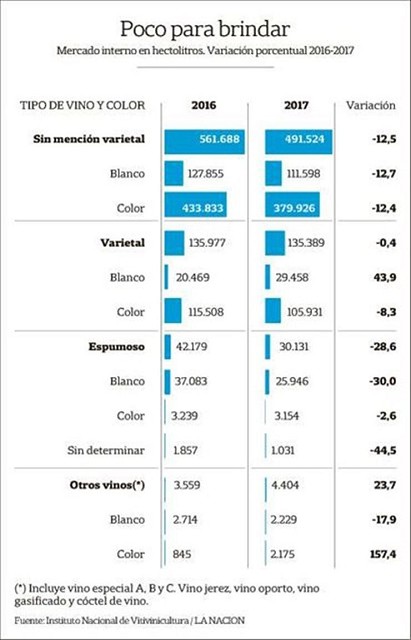 El mercado interno, que responde por el 80% de las ventas totales, cayó 5,4%, a 8.910.303 hectolitros (891 millones de litros) de vino comercializados el año pasado contra 9.417.875 hectolitros (941 millones de litros) de 2016.