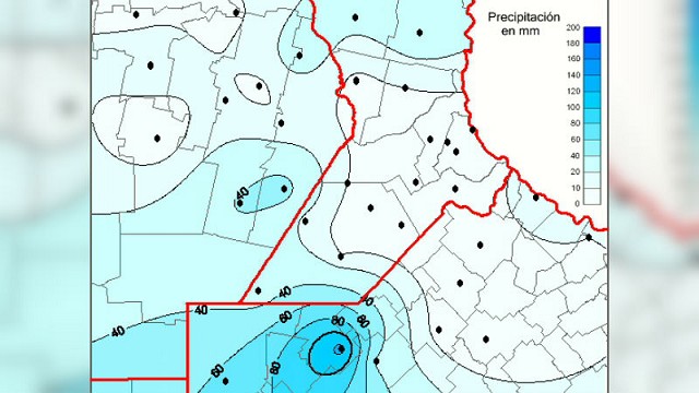 Otro foco más moderado estuvo en la zona aledaña del sureste cordobés. Allí, Guatimozín y Canals registraron 48 mm y 42 mm respectivamente. Lincoln, Noetinger, Rufino, Irigoyen y Carlos Pellegrini fueron privilegiadas con lluvias en torno de los 30 mm. El 20 % restante de la zona recibió entre 10 y 15 mm. Y el 50% de la región núcleo no recibió lluvias.