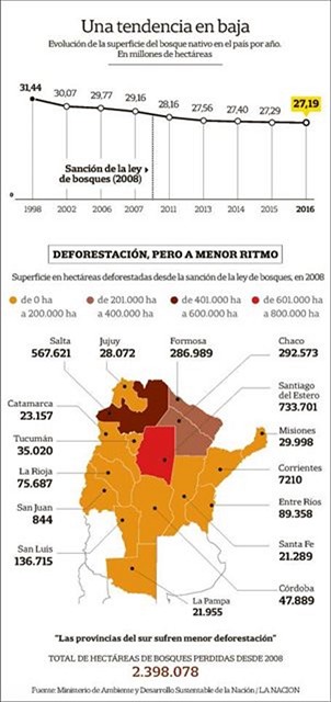 En 2016, fueron taladas más de 130.000 hectáreas boscosas y, según la información del Ministerio de Ambiente y Desarrollo Sustentable, a cargo del monitoreo de los bosques en todo el territorio nacional, la reducción se adecua a lo posible y razonable, en un proceso que pretende alcanzar la meta de deforestación neta cero antes de 2020.