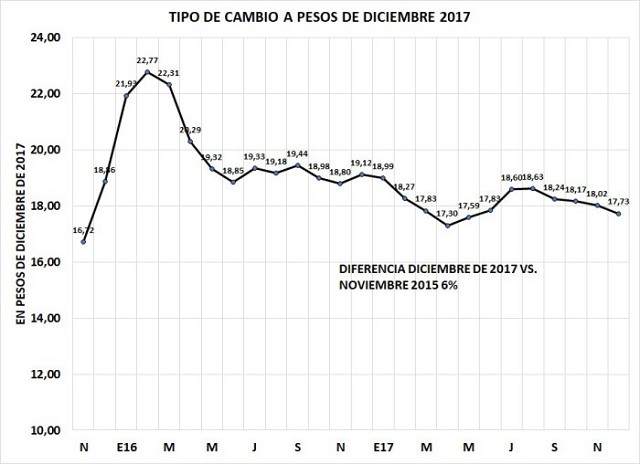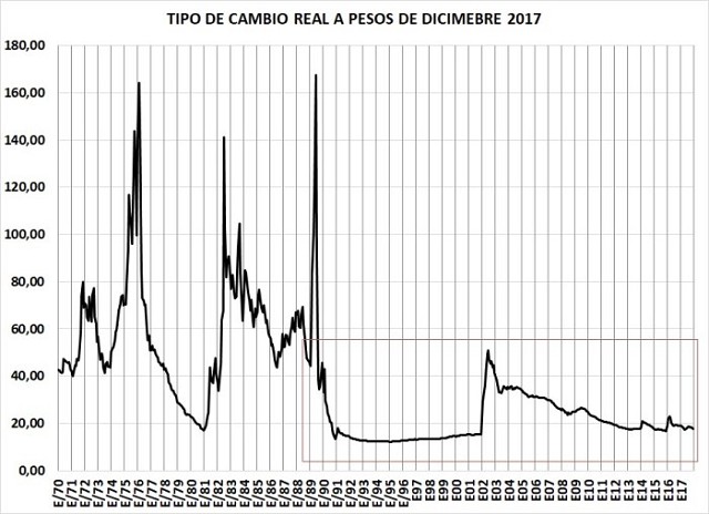 Si uno observa la evolución del tipo de cambio a pesos de diciembre de 2017 puede verificar que luego de usar artilugios para mantener pisado el tipo de cambio con endeudamiento o con la zanahoria de la tasa de interés, luego viene un salto. Sin embargo desde 1991 hemos tenido un tipo de cambio en el nivel más bajo de la serie histórica durante 27 años seguidos, salvo el salto de 2002 con la devaluación de Duhalde.