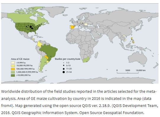 Worldwide distribution of the field studies reported in the articles selected for the meta-analysis. Area of GE maize cultivation by country in 2016 is indicated in the map (data from4). Map generated using the open source QGIS ver. 2.18.9. (QGIS Development Team, 2016. QGIS Geographic Information System. Open Source Geospatial Foundation. http://qgis.osgeo.org).
