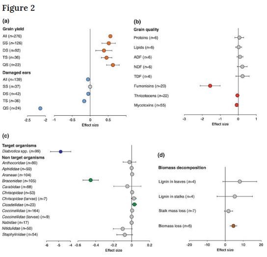In conclusion, our meta-analysis of 21 years of field data on the agro-environmental impact of GE maize clearly shows the benefits in terms of increases in grain yield and quality, and in decreases of the target insect Diabrotica spp. Our analysis highlights modest or no effect on the abundance of non-target insects, suggesting no substantial effect on insect community diversity. This confirms previous results on NTOs and extends our knowledge to new taxa. We provide also strong evidence that GE maize cultivation reduces mycotoxin content in grain. Since mycotoxin contamination in maize grain annually leads to high economic losses in all regions of the world, the protection of maize plants through the use of GE technology against the damage of insects, favouring the development of toxinogenic fungi, can be seen as an effective tool to reduce the contamination of grain. This can lead to increases in economic income and quality of the production and to reductions in the human exposure to mycotoxins, thus reducing health risks. Finally, as GE technology moves forward involving new crops, new traits and new adopting countries, new experimental field data should be made available in an open and standardized format allowing researchers and regulators to draw further conclusions on the agro-environmental and health risks of GE crops.