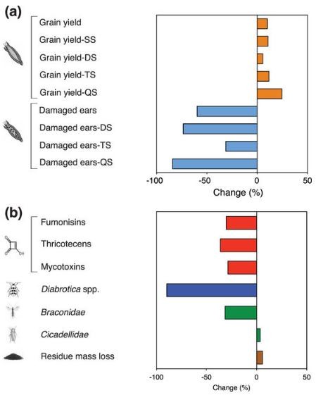 Response ratios. Effects of GE maize hybrids on the significant traits: grain yield and damaged ears (a), grain quality (fumonisins, thricotecenes, mycotoxins), target (Diabrotica spp.) and non-target (Braconidae, Cicadellidae) organisms and residue mass loss (b). The response ratio was calculated as the mean percentage of change for the weighted Hedge’s g (g+) values different from zero between the GE hybrids and their isolines. SS = single eventhybrid; DS = double stacked hybrid; TS = triple stacked hybrid; QS = quadruple stacked hybrid.