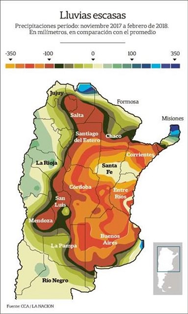 Según se desprende del análisis de imágenes de la Consultora de Climatología Aplicada (CCA), en los últimos cuatro meses se registraron entre 100 y 400 milímetros menos respecto de lo normal para el promedio de lluvias caídas desde 1973. En ese período, clave para la siembra y el desarrollo del maíz y de la soja, las lluvias suelen estar entre los 450 y los 550 milímetros. "Estamos ante una anomalía fortísima, muy generalizada", dijo a la nacion Germán Heinzenknecht, meteorólogo de CCA.